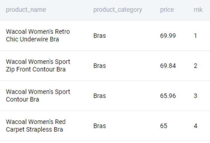 ;This gives the same result as earlier. Now we need to find the costliest item in each category. To do this we use the window function RANK(), partitioning over the product category.