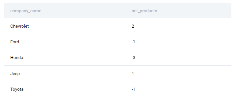 Our output is going to be the name of the companies and net difference between two numbers.