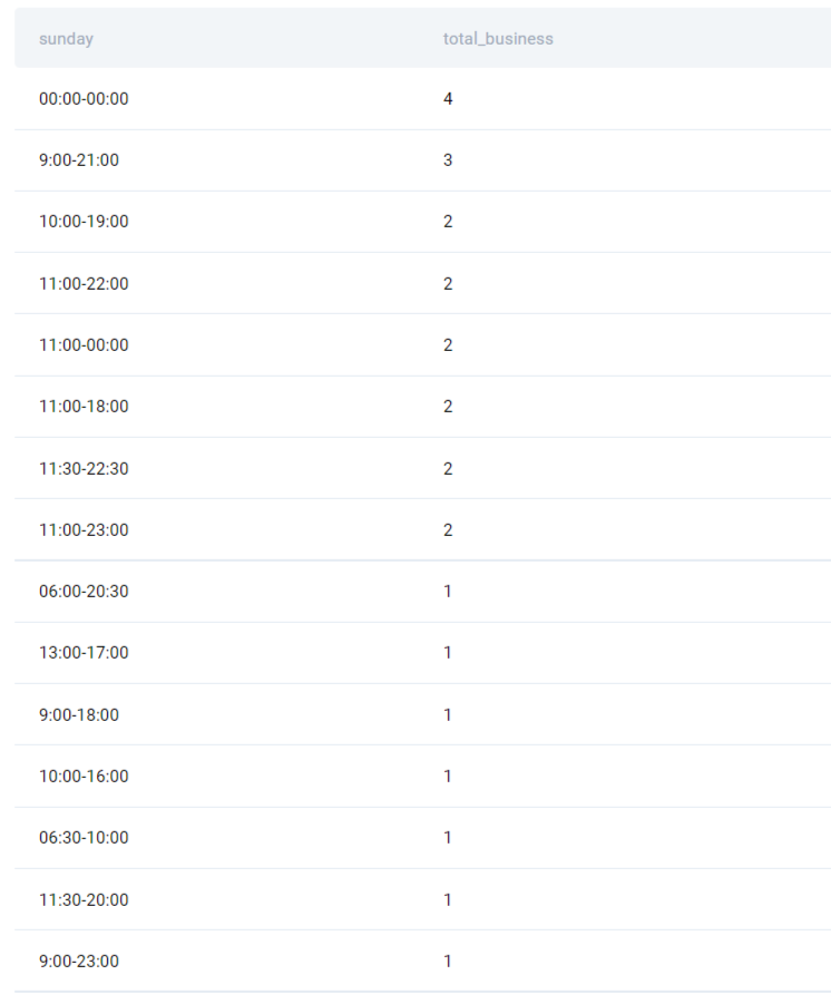 At this point, we have separate rows for every business that operates on a specific time-slot on sunday. We use the GROUP BY statement to aggregate the number of businesses for each time slot. Finally, we use the ORDER BY statement to arrange them in a descending order.