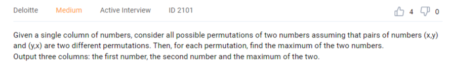 CROSS JOIN deloitte_numbers AS dn2Finally, we can write a CASE clause to output the number that is higher of the two.