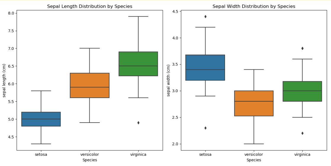 - Box Plots: The accurate distribution of sepal dimensions and the level of variability in each species can help to detect outliers and highlight the most discriminative features.