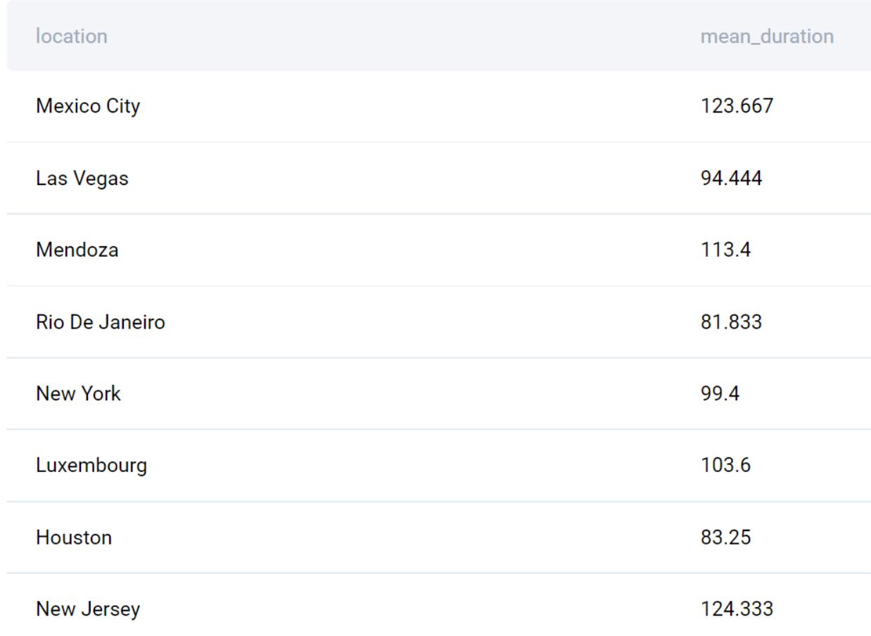This query’s output shows all the customers’ locations and the average duration for each location.