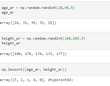 Another indirect sorting option available is the lexsort. The lexsort method allows sorting across different arrays in a specified order. Suppose there are two arrays – the first containing the age of five persons and the second containing the height. If we want to sort these on age and then height, we can use the lexsort method. The result will be the indexes that will consider both the sorting orders.