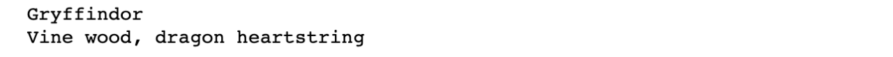wands = ['Holly, phoenix feather', 'Vine wood, dragon heartstring', 'Willow, unicorn hair']