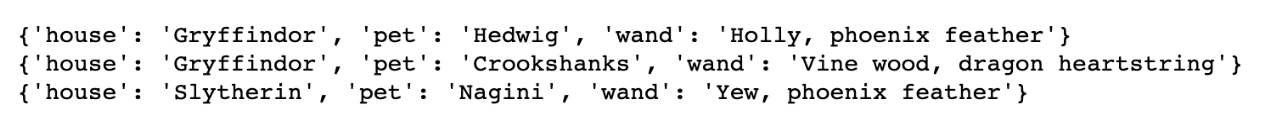 What is a comprehension, you might ask. The expression {"house": house, "pet": pet, "wand": wand} for house, pet, wand in zip(houses, pets, wands) is a dictionary comprehension, a concise way to create dictionaries from iterables.