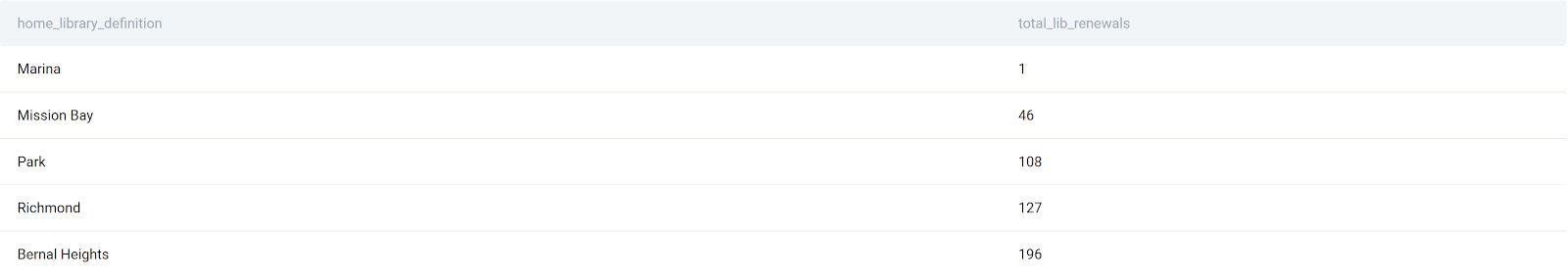 The question asks to output the home library definition and its number of total renewals. To get this, we’ll need to use only two columns from the table: total_renewals and home_library_definition.