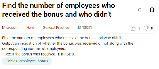 You can solve this problem here: https://platform.stratascratch.com/coding/10081-find-the-number-of-employees-who-received-the-bonus-and-who-didnt