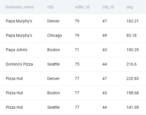 Then we subset the cities for Boston and business names for pizza. There are multiple ways to go about it. We can convert all strings to lowercase (or uppercase) and then use the LIKE function. Alternatively, with Postgres, we have the ILIKE function that is case-insensitive LIKE. We use both of them to demonstrate how it works.